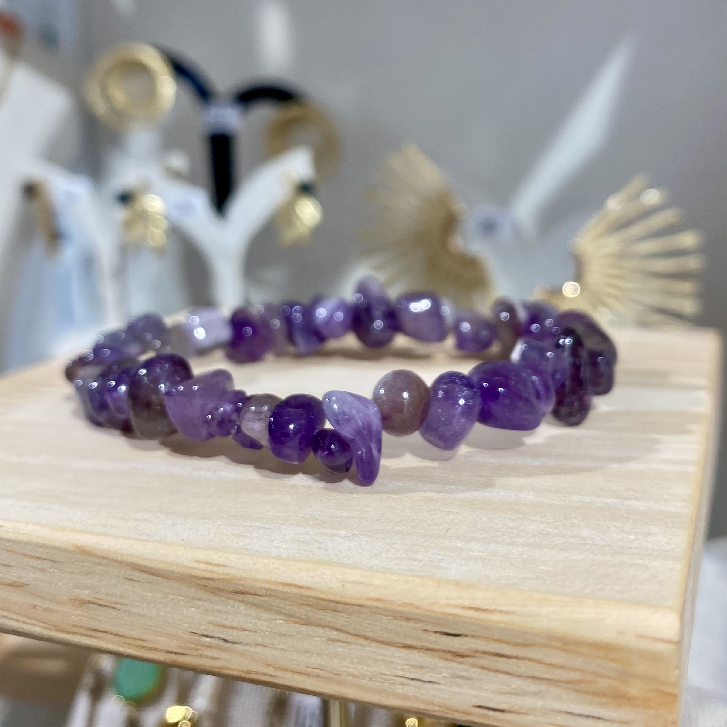 Ce bracelet en améthyste est composé de pierres naturelles brutes, aux teintes violettes foncées et profondes, avec un aspect majoritairement opaque. Chaque pierre, non polie et aux formes irrégulières, révèle un caractère intense et authentique, offrant un rendu à la fois brut et élégant.