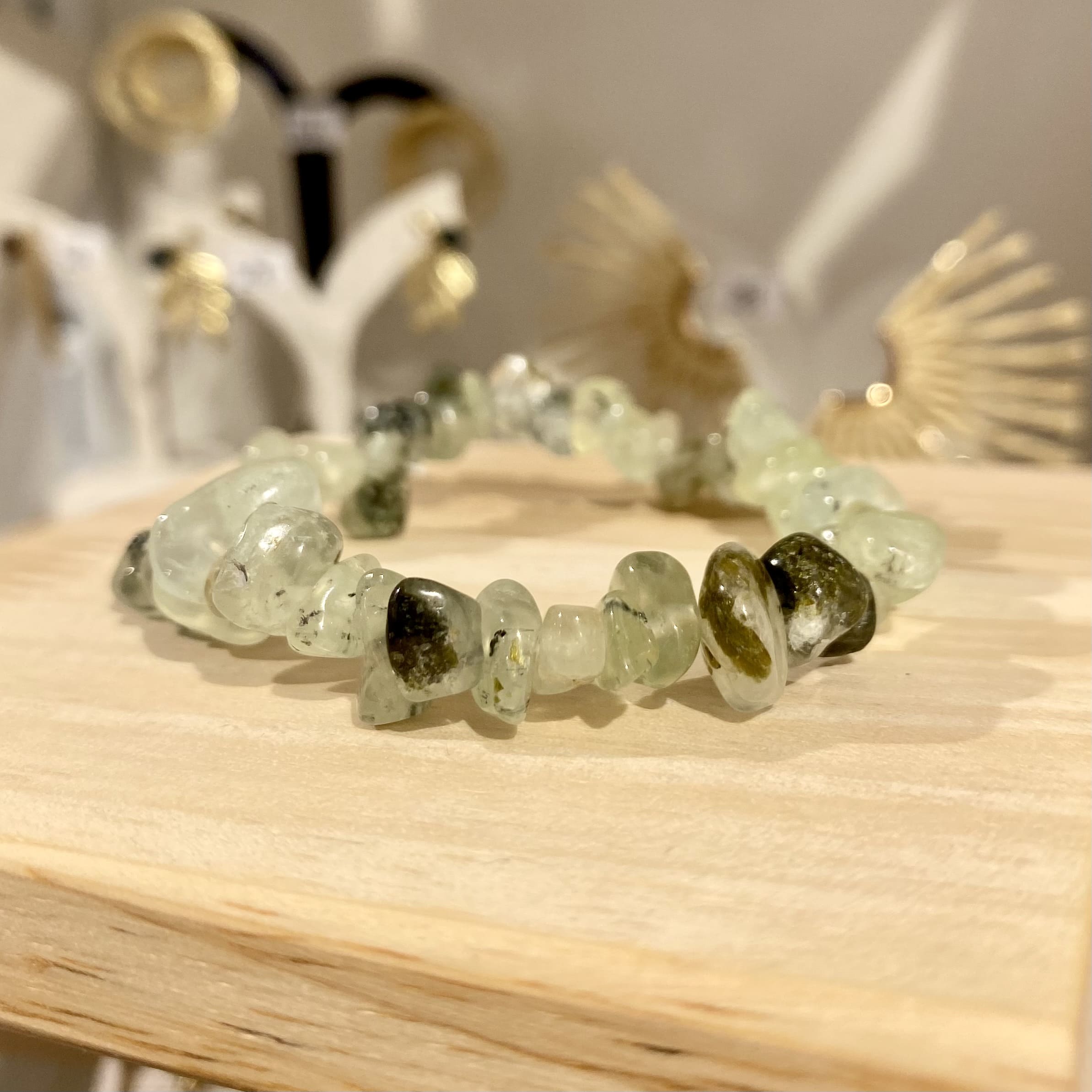 La préhnite se caractérise par ses teintes vert pâle à vert jaune, avec un aspect légèrement translucide et des inclusions naturelles qui lui donnent un rendu nuageux unique. Ce bracelet en pierres brutes offre un style plus organique et authentique qu’un bijou en perles polies.