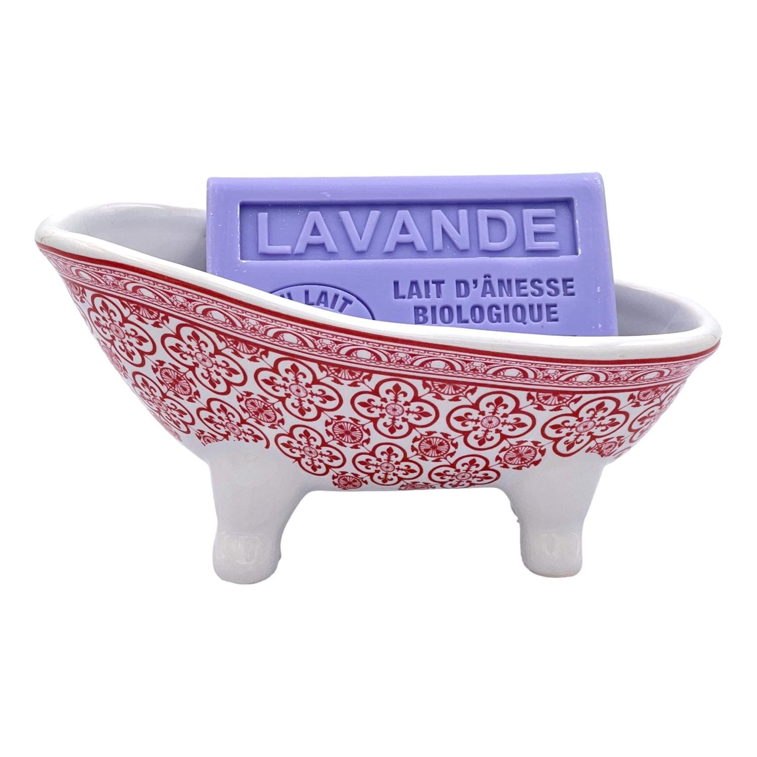 Porte‑savon en céramique à la silhouette baignoire, orné d’un motif ornemental rouge inspiré de fleurs de lys. Compact et stable sur ses trois pieds, il dispose d’un petit trou d’évacuation pour préserver le savon de l’humidité. Finition brillante, nettoyage facile — vendu sans savon.