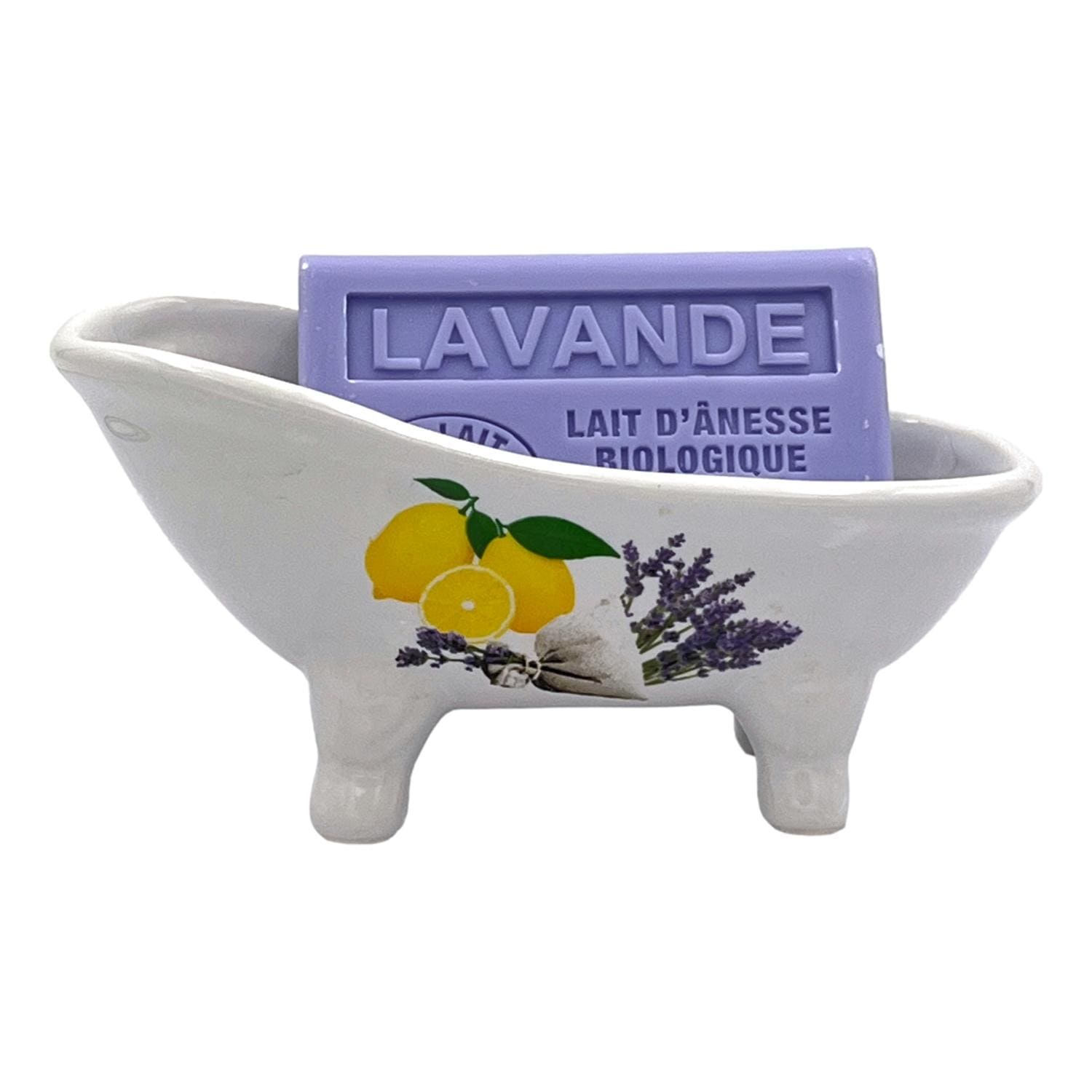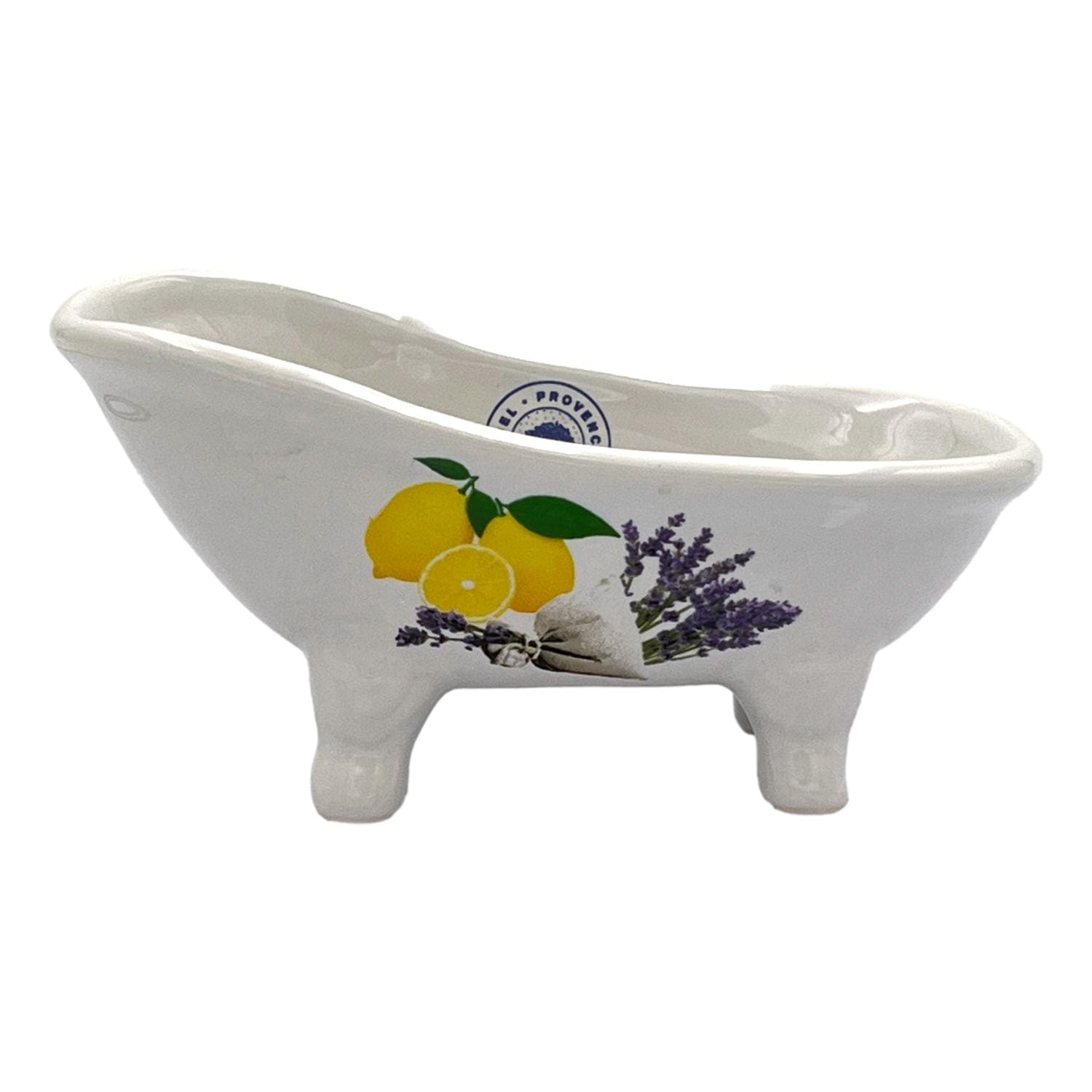 Original et frais, ce porte‑savon en céramique reprend la silhouette d’une petite baignoire avec un imprimé coloré représentant des citrons et des brins de lavande, pour une allure provençale-chic. Finition brillante, surface facile à nettoyer et base stable — vendu sans savon