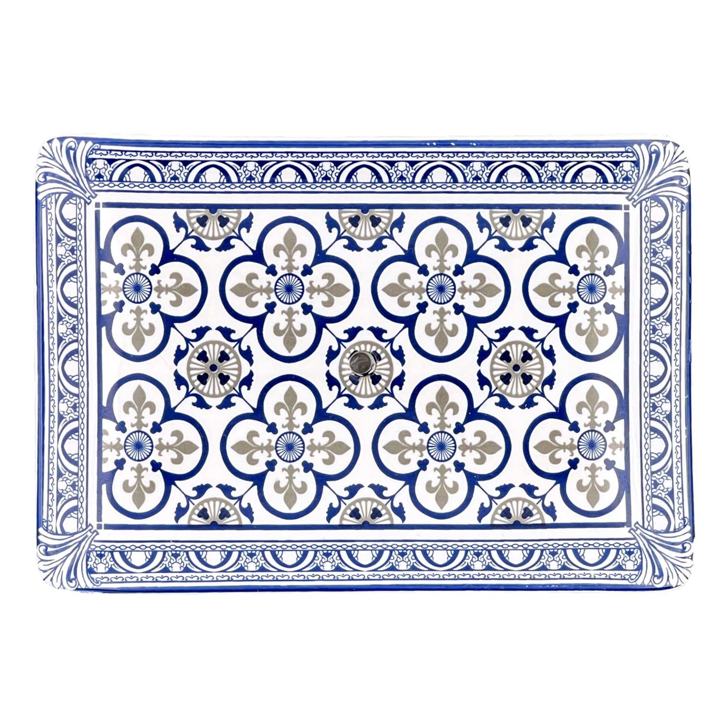 Élégant et fonctionnel, ce porte-savon rectangulaire en céramique arbore un motif ornemental de fleurs de lys bleues pour sublimer votre salle de bain. Finition lisse et résistante, petit trou d’évacuation discret pour éviter l’eau stagnante et préserver votre savon. Design raffiné qui allie style classique et modernité — idéal pour une décoration soignée.